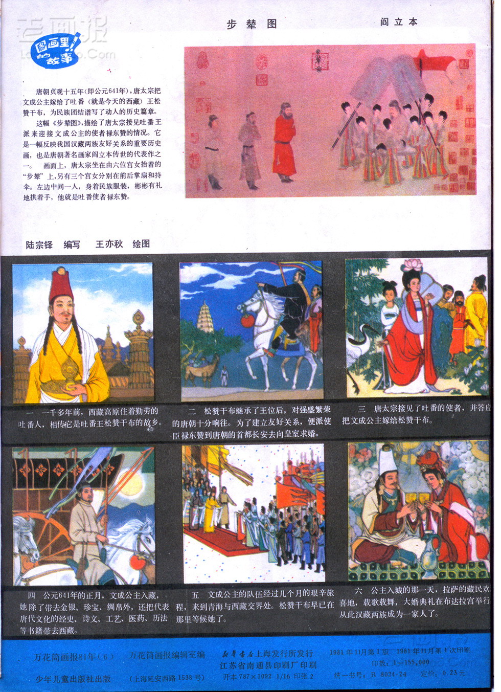 阎立本《步辇图》-图画里的的故事 原著:佚名 编文:陆宗铎 绘画:王亦秋 原载:万花筒连环画报 1981年6期 海阔中文网画报藏书扫描 目录 |<< < 上一页 下一页 > >>| 阎立本《步辇图》-图画里的的故事 < 上一页下一页 >