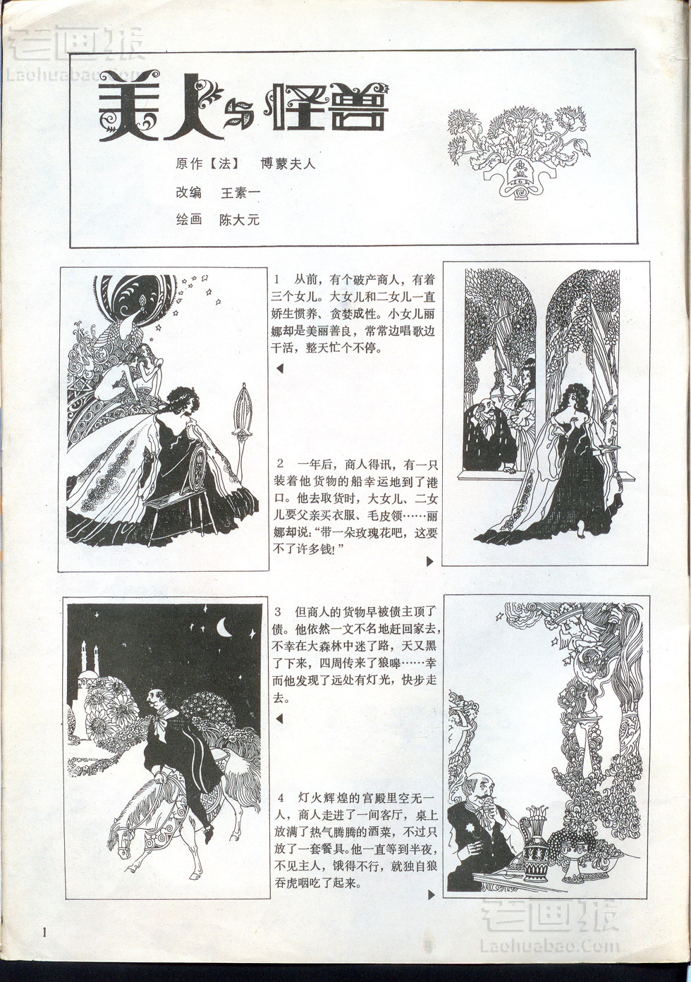 美人与怪兽 原著:[法]博蒙夫人 编文:王素一 绘画:陈大元 原载:万花筒连环画报 1987年2期 海阔中文网画报藏书扫描 1 2 3 4 目录 |<< < 上一页 下一页 > >>| 美人与怪兽 < 上一页下一页 >