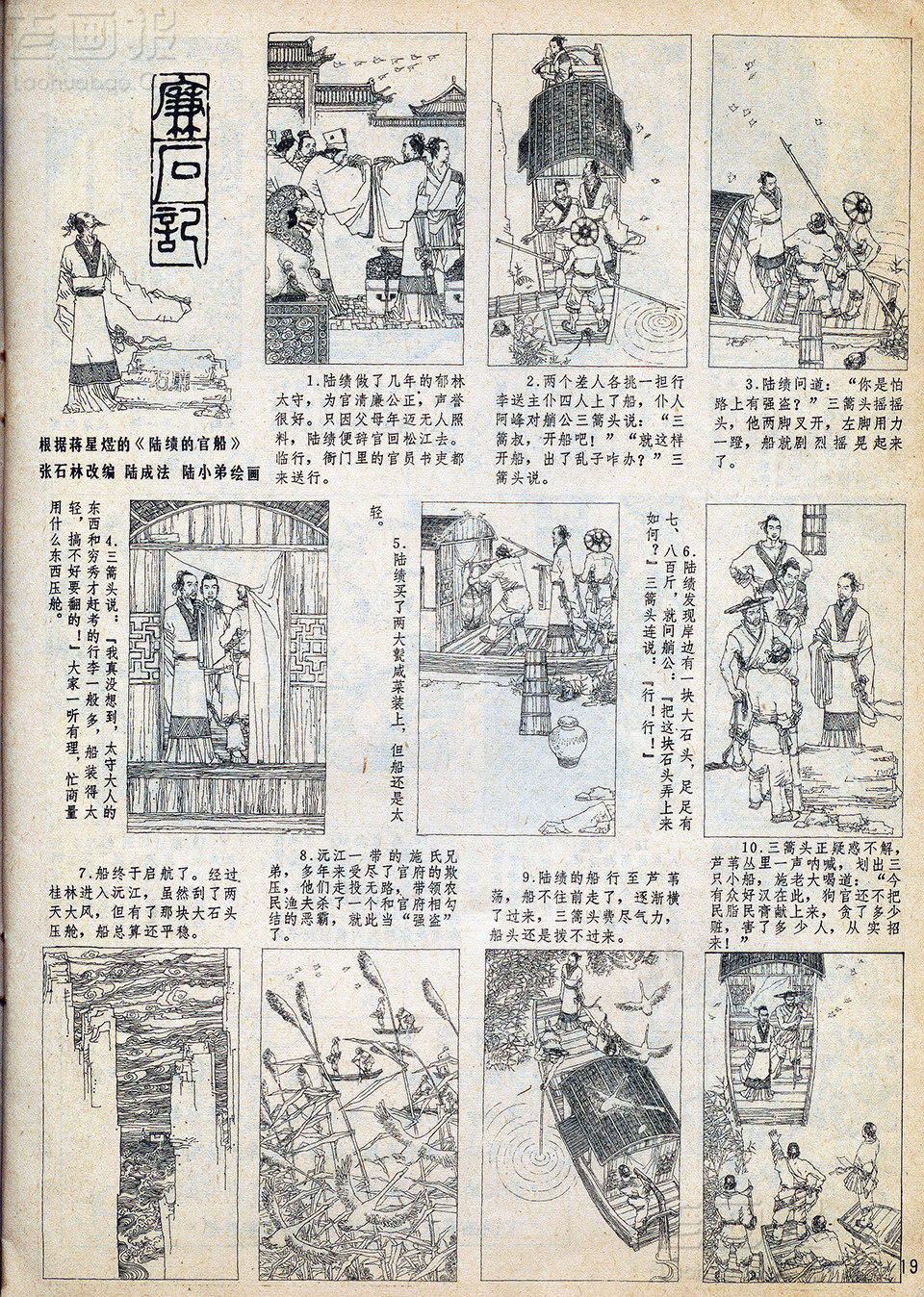廉石记 原著:蒋星煜《陆绩的官船》 编文:张石林 绘画:陆成法,陆小弟 原载:富春江画报 1983年8期 海阔中文网画报藏书扫描 1 2 目录 |<< < 上一页 下一页 > >>| 廉石记 < 上一页下一页 >