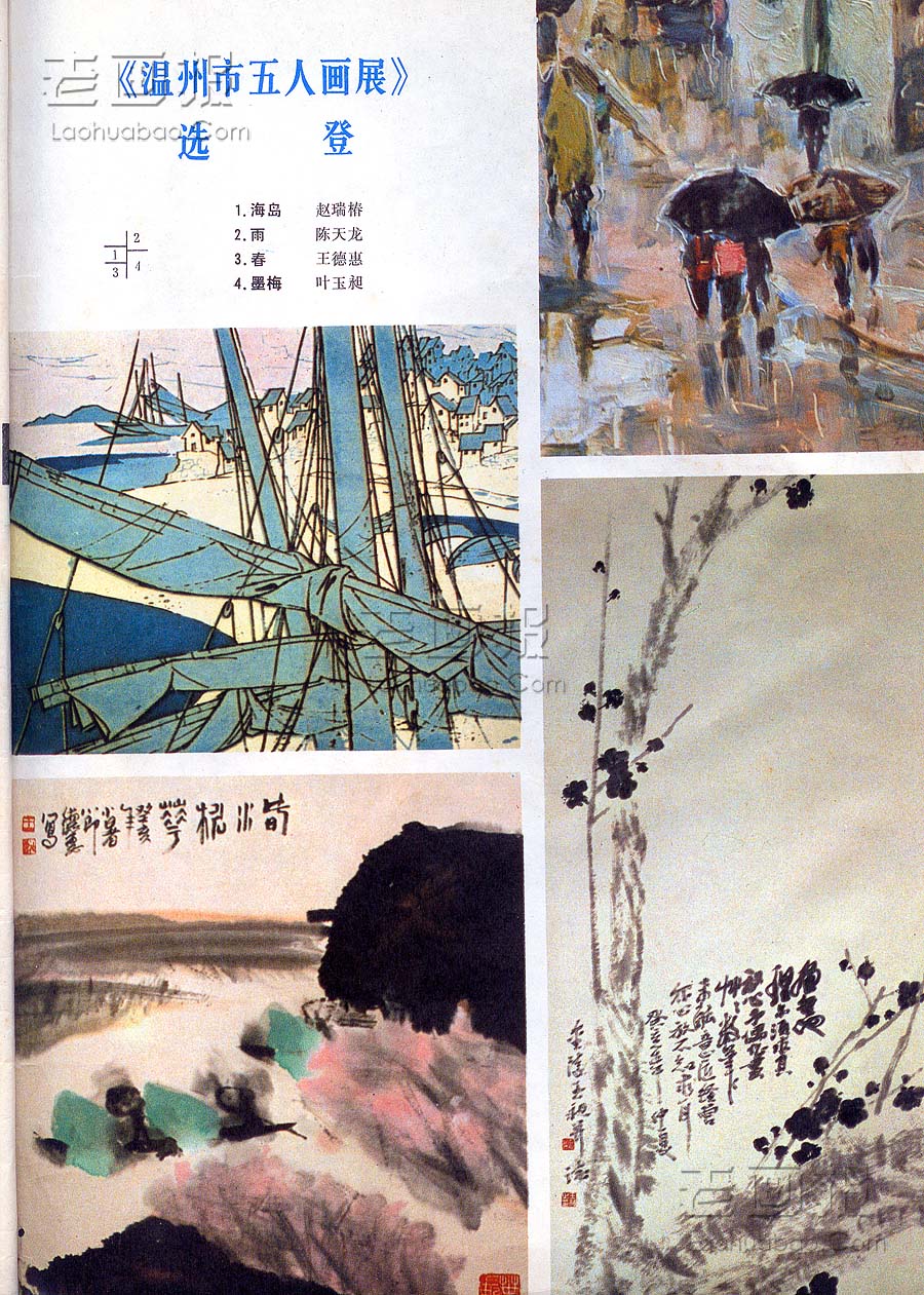 《温州市五人画展》选登 海岛 雨 春 墨梅 原著:佚名 编文:佚名 绘画:赵瑞春 陈天龙 王德惠 叶玉昶 原载:富春江画报 1984年1期 海阔中文网画报藏书扫描 目录 |<< < 上一页 下一页 > >>|