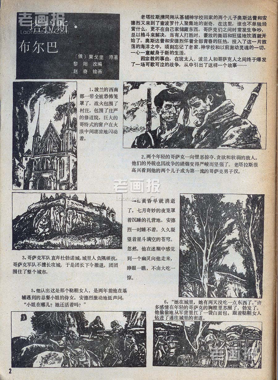 塔拉斯. 布尔巴 原著:[俄]果戈里 编文:黎阳 绘画:赵奇 原载:富春江画报 1987年8期 海阔中文网画报藏书扫描 1 2 3 4 5 6 7 目录 |<< < 上一页 下一页 > >>| 塔拉斯. 布尔巴 < 上一页下一页 >