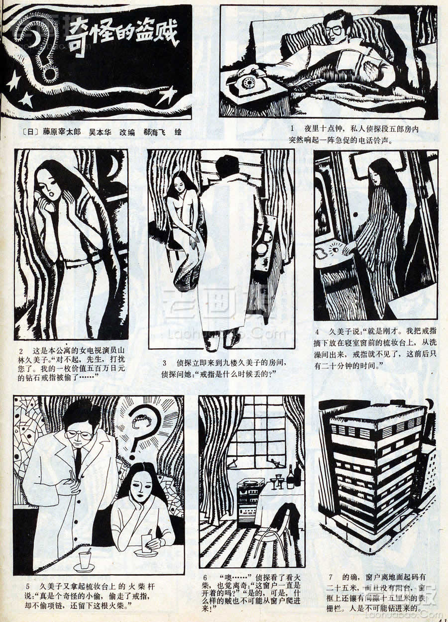 奇怪的盗贼 原著:[日]藤原宰太郎 编文:吴本华 绘画:郗海飞 原载:连环画报 1982年5期 海阔中文网画报藏书扫描 "t1" 4 久美子说:“就是刚才。我把戒指摘下放在寝室窗前的梳妆台上,从洗澡间出来,戒指就不见了,这前后只有二十分钟的时间。”"/t1" 1 2 目录 |<< < 上一页 下一页 > >>| 奇怪的盗贼 < 上一页下一页 >