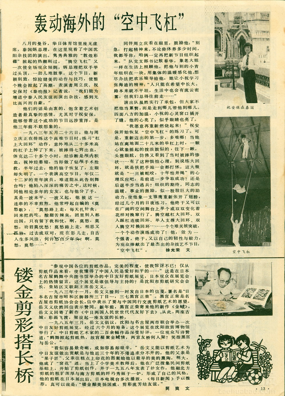 剪纸艺术家:岳文义 原著:阿爽 编文:佚名 新春画报 1986年第11期 海阔中文网画报藏书扫描制作 转载请注明出处 目录 |<< < 上一页 下一页 > >>| 剪纸艺术家:岳文义 < 上一页下一页 >