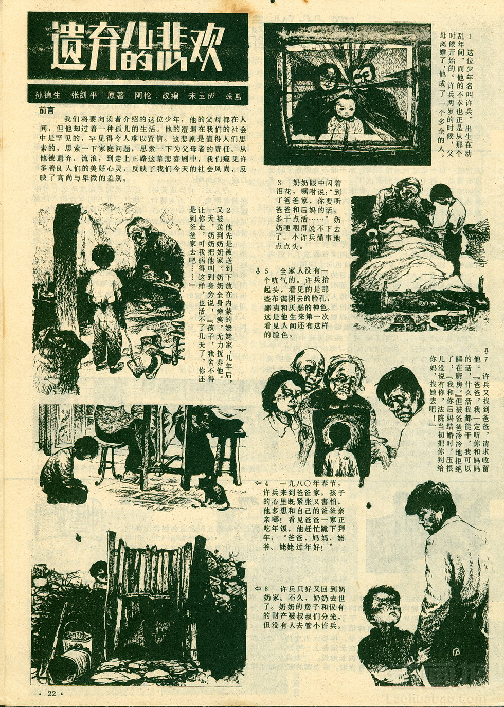 连环画 遗弃儿的悲欢 原著:孙德生,张剑平 编文:阿伦 绘画:宋玉成 新春画报 1986年第11期 海阔中文网画报藏书扫描制作 转载请注明出处 1 2 3 4 目录 |<< < 上一页 下一页 > >>| 遗弃儿的悲欢 < 上一页下一页 >
