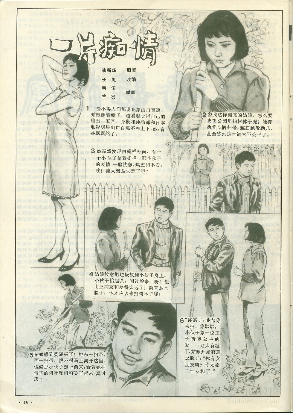 连环画 一片痴情 原著:翁新华 编文:长虹 绘画:韩伍,生发 新春画报 1987年第8期 海阔中文网画报藏书扫描制作 转载请注明出处 1 2 目录 |<< < 上一页 下一页 > >>| 一片痴情 < 上一页下一页 >