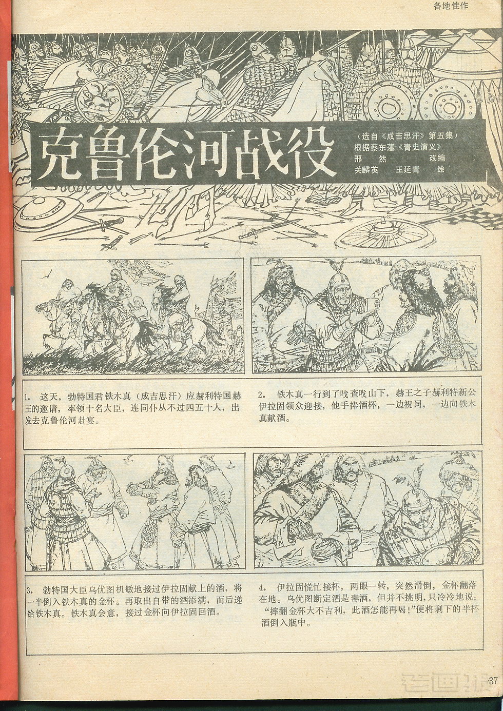 连环画 克鲁伦河战役(选自《成吉思汗》第五集) 原著:蔡东潘《清史演义》 编文:刑然 绘画:关麟英,王延青 中国连环画 1987年第8期 海阔中文网画报藏书扫描制作 转载请注明出处 1 2 3 4 5 6 7 目录 |<< < 上一页 下一页 > >>| 克鲁伦河战役(选自《成吉思汗》第五集) < 上一页下一页 >