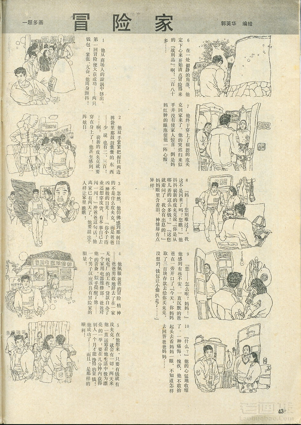 连环画 冒险家(一题多画3) 编文:郭英华 绘画:郭英华 中国连环画 1988年第11期 海阔中文网画报藏书扫描制作 转载请注明出处 目录 |<< < 上一页 下一页 > >>| 冒险家(一题多画3) < 上一页下一页 >