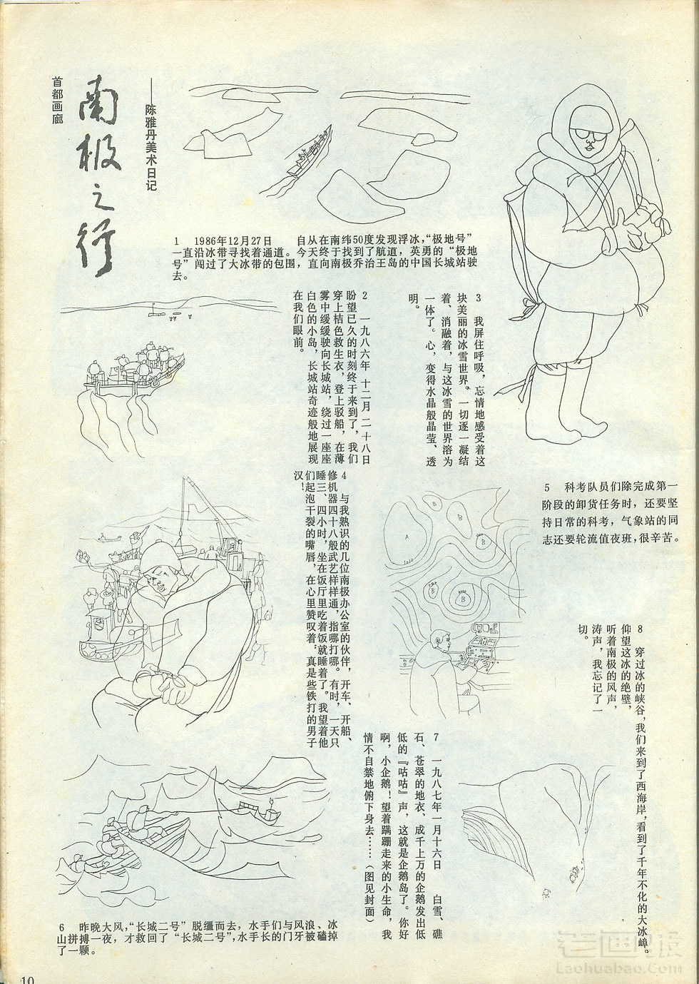 连环画 南极之行 陈雅丹美术日记 第2页 编文:佚名 绘画:陈雅丹 中国连环画 1988年第2期 海阔中文网画报藏书扫描制作 转载请注明出处 1 2 3 4 目录 |<< < 上一页 下一页 > >>| 南极之行 陈雅丹美术日记 < 上一页下一页 >