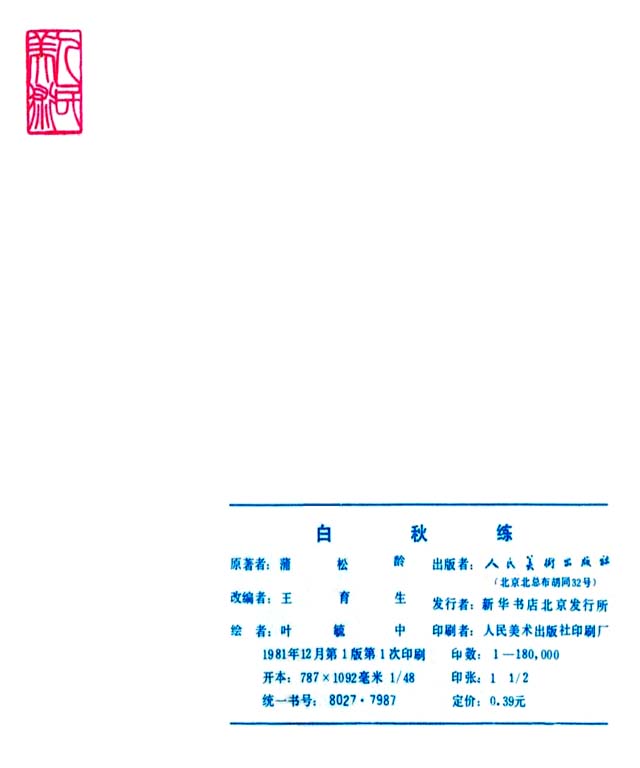 白秋练 【彩版聊斋故事】 第10页 原著:《聊斋志异》蒲松龄 编文:王育生 绘画:叶毓中 人民美术出版社 1981年 这本连环画来源于网络,并非海阔中文网画报藏书,详细出处请见图片水印和制作说明,感谢连友扫描,如有不妥请及时告知。 01 02 03 04 05 06 07 08 09 10 … 目录 |<< < 上一页 下一页 > >>| 白秋练 【彩版聊斋故事】 < 上一页下一页 >