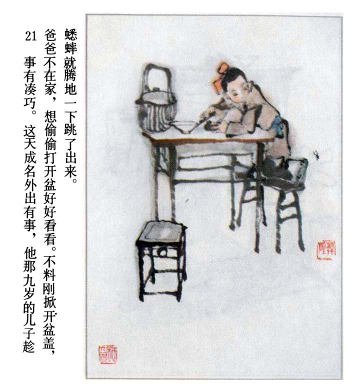 促织 【彩版聊斋故事】 第3页 原著:《聊斋志异》蒲松龄 编文:王育生 绘画:施大畏,韩硕 人民美术出版社 1981年 这本连环画来源于网络,并非海阔中文网画报藏书,详细出处请见图片水印和制作说明,感谢连友扫描,如有不妥请及时告知。 1 2 3 4 5 6 7 8 目录 |<< < 上一页 下一页 > >>| 促织 【彩版聊斋故事】 < 上一页下一页 >