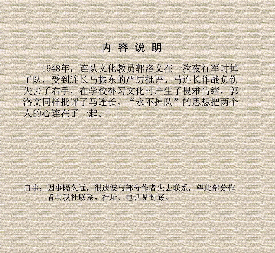 永不掉队 原著:【苏联】阿.龚察尔 编文:洪岳 张市 绘画:刘继卣 人民美术出版社 2011年 这本连环画来源于网络,并非海阔中文网画报藏书,详细出处请见图片水印和制作说明,感谢连友扫描,如有不妥请及时告知。 01 02 03 04 05 06 07 08 09 10 … 目录 |<< < 上一页 下一页 > >>| 永不掉队 < 上一页下一页 >