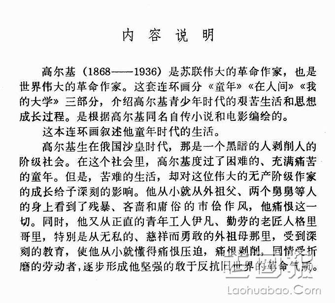 童年 高尔基故事之一 原著:高尔基 编文:佚名 绘画:董洪元 人民美术出版社 1970年 01 02 03 04 05 06 07 08 09 10 … 目录 |<< < 上一页 下一页 > >>| 童年 高尔基故事之一 < 上一页下一页 >