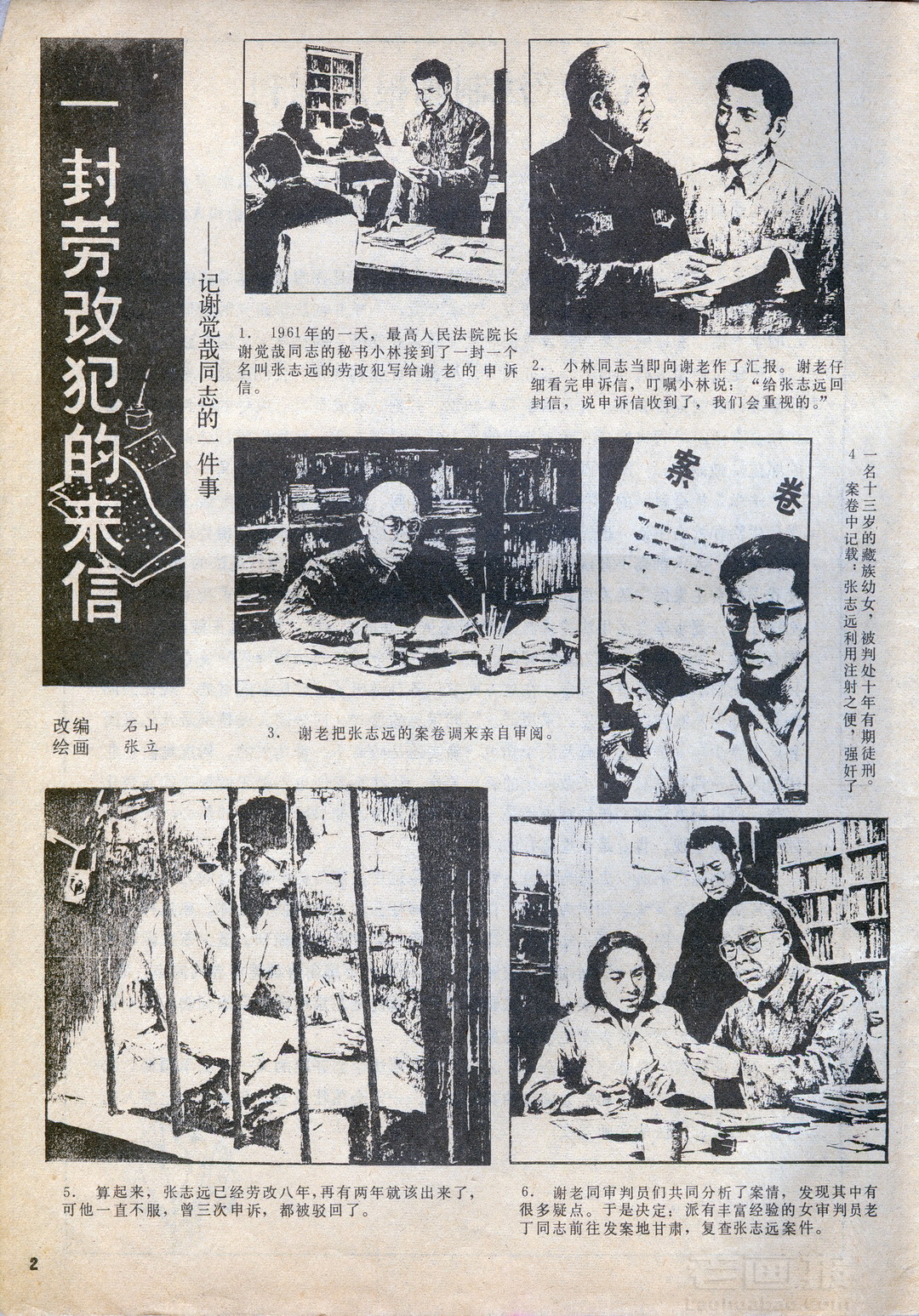 连环画 《一封劳改犯的来信》 谢觉哉院长的一件事 编文:石山 绘画:张立 法制画报 1985年第1期 海阔中文网画报藏书扫描制作 转载请注明出处 1 2 3 目录 |<< < 上一页 下一页 > >>| 一封劳改犯的来信 谢觉哉院长的一件事 < 上一页下一页 >