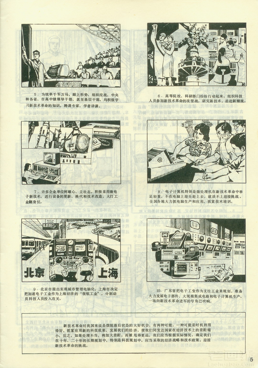 连环画 《迎接新技术革命的挑战》 第2页 编文:陈开 绘画:青云 科普画刊 1984年第4期 海阔中文网画报藏书扫描制作 转载请注明出处 新技术革命对我国来说是摆脱落后状态的大好机会。有两种可能,一种可能是时机利用得好,抓紧应用新的科技成果,发展我们的经济,使我们同发达国家在经济技术上的差距缩小。反之,如果处理不当,将加大差距,而被甩得更远。我们应当根据实际情况,确定我们在十年、二十年的长期规划中,特别是科技规划中,应当采取的经济战略和技术政策,迎接新技术革命的挑战。 1 2 目录 |<< < 上一页 下一页 > >>| 迎接新技术革命的挑战 < 上一页下一页 >