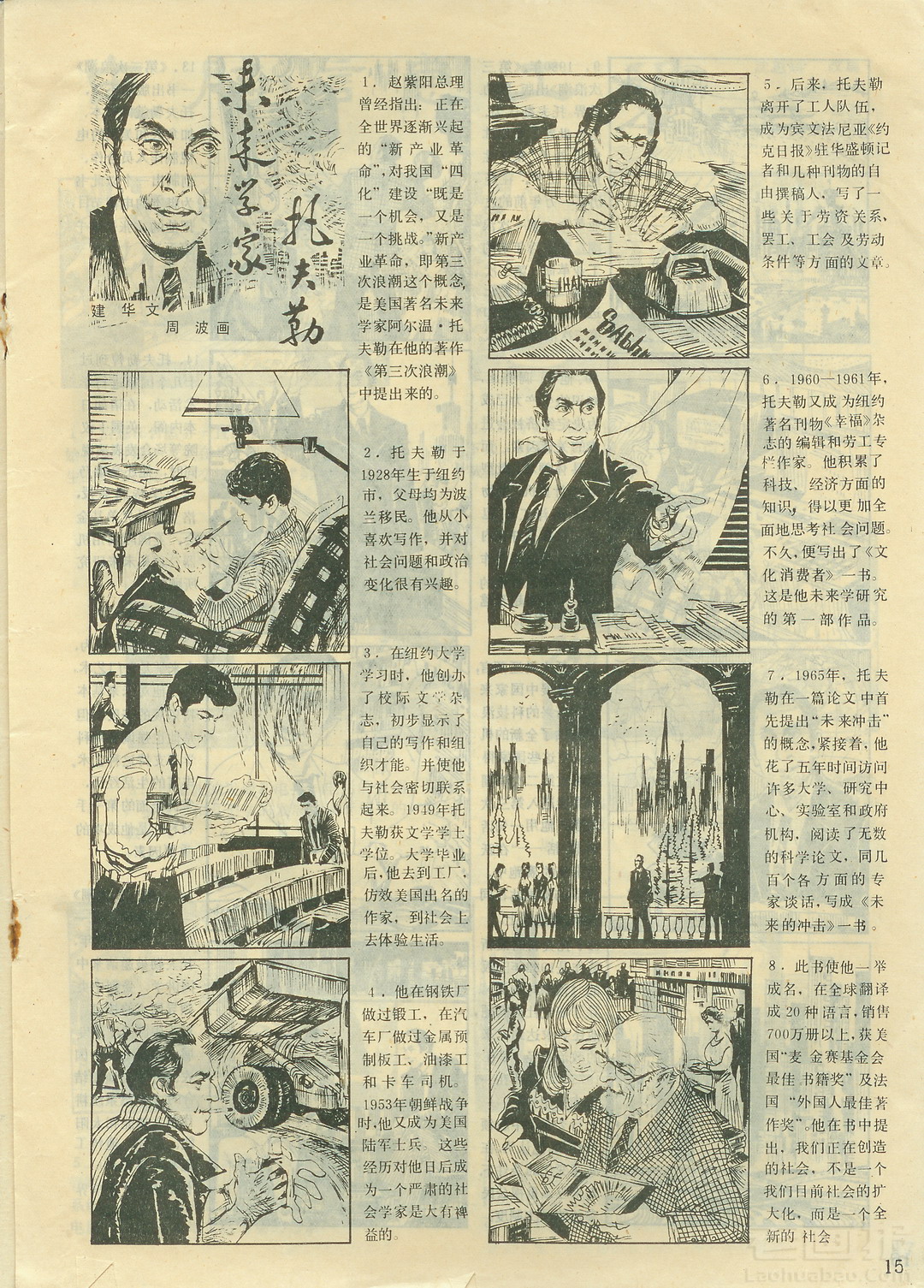连环画 《未来学家托夫勒》 编文:建华 绘画:周波 科普画刊 1985年第1期 海阔中文网画报藏书扫描制作 转载请注明出处 1 2 目录 |<< < 上一页 下一页 > >>| 未来学家托夫勒 < 上一页下一页 >