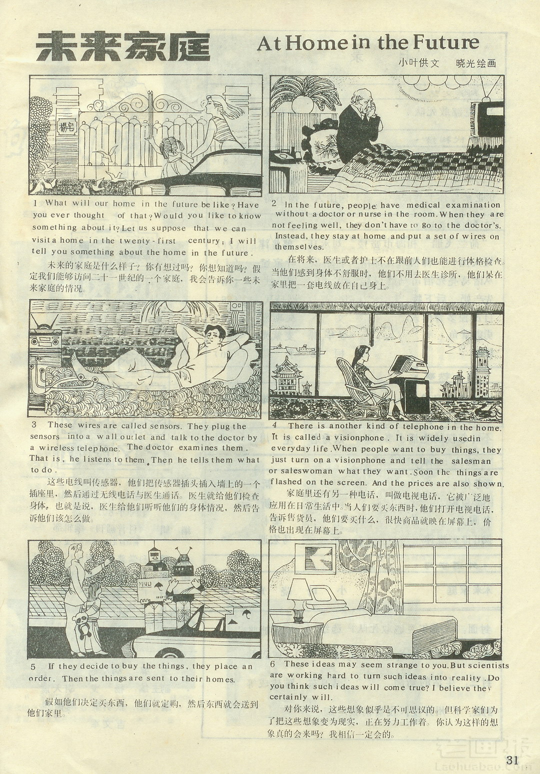 连环画 《未来家庭》 英语连环画 编文:小叶 绘画:晓光 科普画刊 1985年第4期 海阔中文网画报藏书扫描制作 转载请注明出处 目录 |<< < 上一页 下一页 > >>| 未来家庭 英语连环画 < 上一页下一页 >