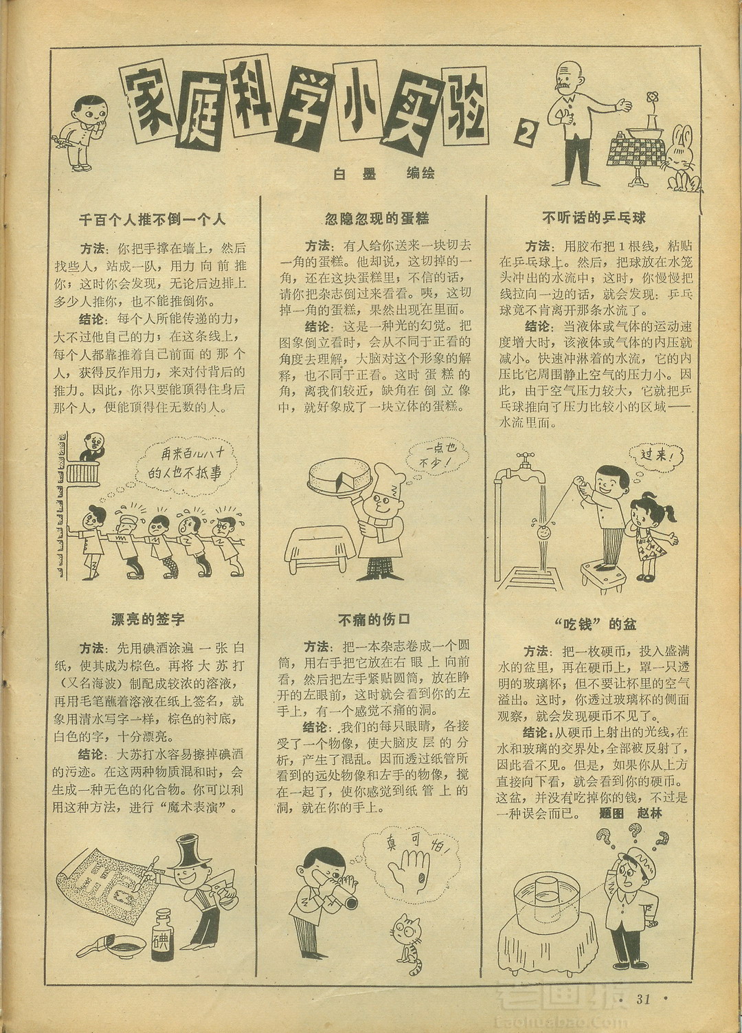 家庭科学小实验 作者:白墨 求知画刊 1981年第2期 海阔中文网画报藏书扫描制作 转载请注明出处 千百个人推不倒一个人,忽隐忽现的蛋,不听话的乒乓球,漂亮的签字,不痛的伤口,“吃钱”的盆 目录 |<< < 上一页 下一页 > >>| 家庭科学小实验 < 上一页下一页 >